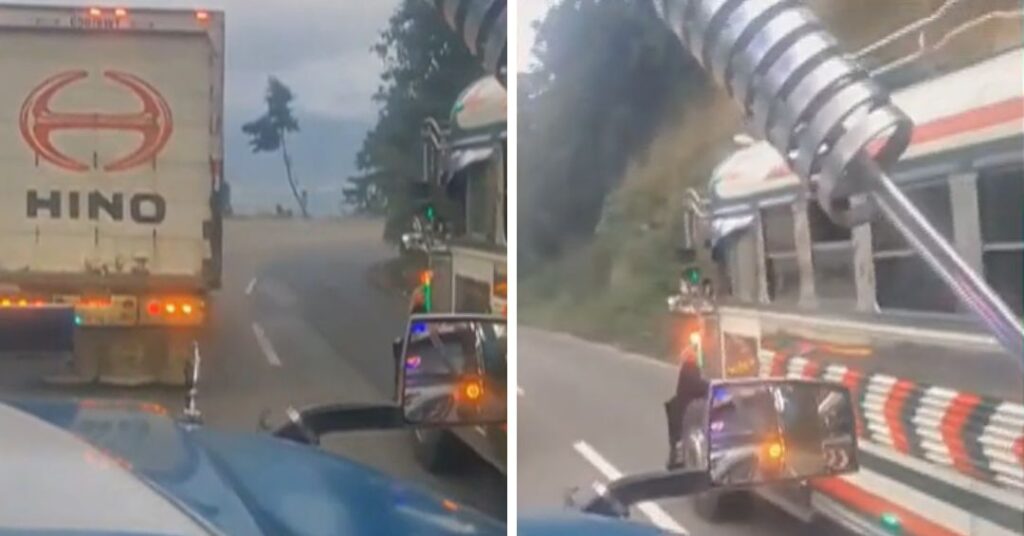 En el video, que se ha hecho viral, se observa a ambos chóferes grabándose mutuamente mientras manejan, llegando a pasar peligrosamente cerca de un tráiler que pudo convertirse en un daño colateral.